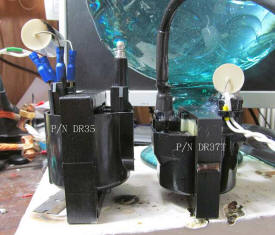 Here are the two coils side by side. The DR35 is much larger than the DR37T and it has a higher high voltage tower. Looked promising. |