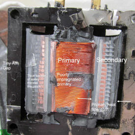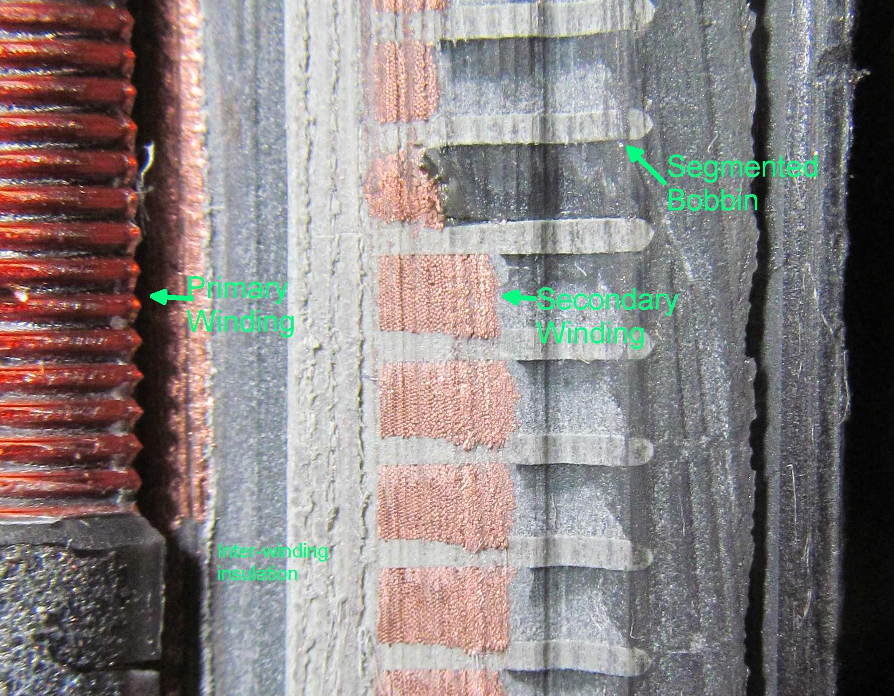 Here is a detail shot of the secondary. Notice how the secondary is wound on a sectional bobbin. That is designed to limit the voltage stress on any one group of windings. Notice the very thick insulation (thermal and electrical) between the primary and secondary. And finally, the large amount of space between the edge of the sectional bobbin and the outer surface. A lot of useless filler epoxy.