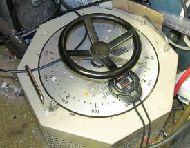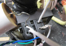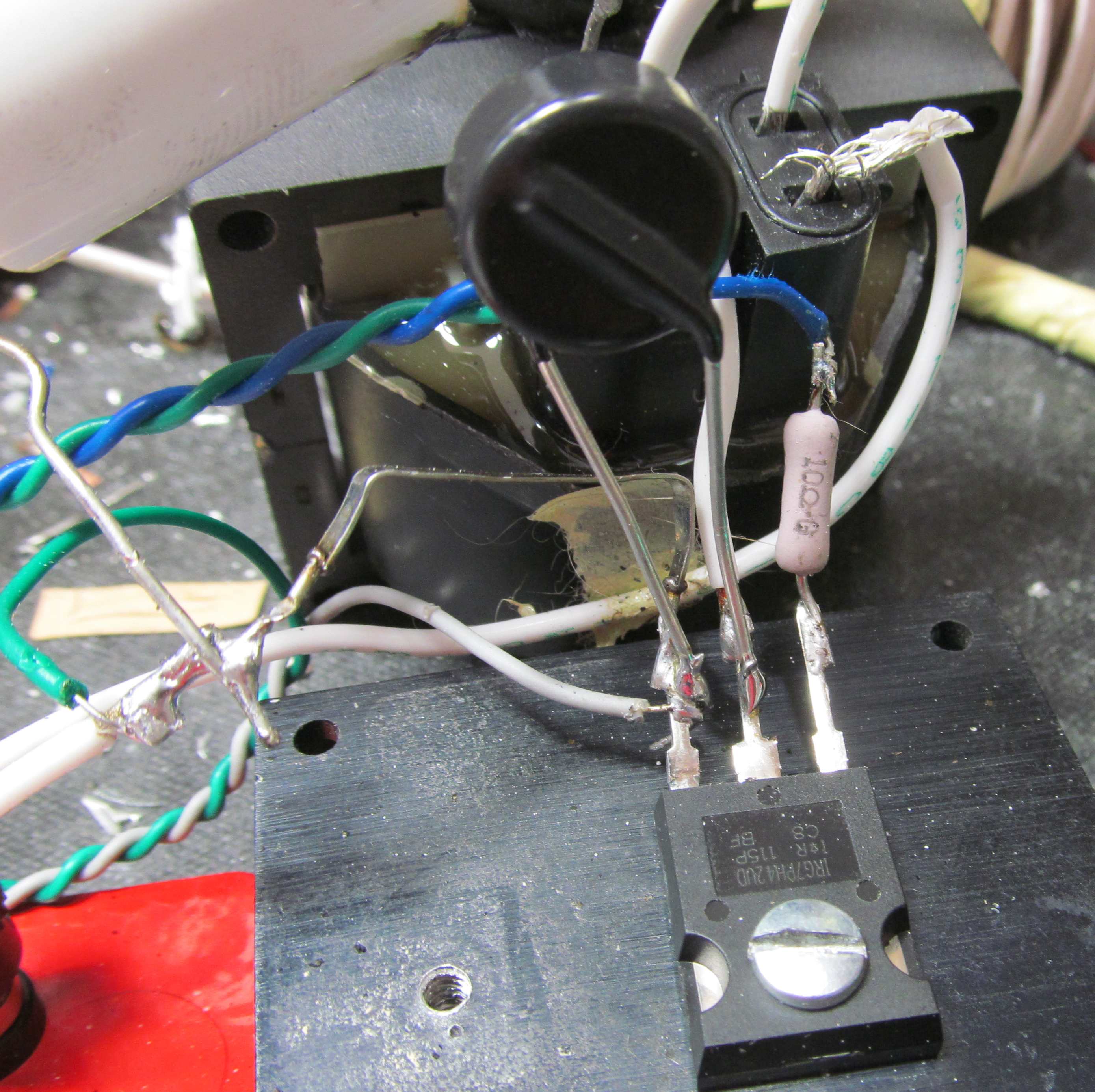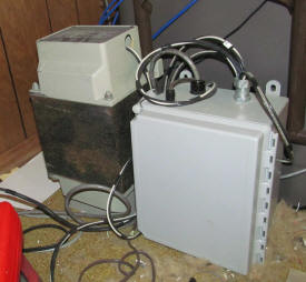 This is the core of my safe working environment (not counting the cat hair, of course :-). On the left is a 5 KVA Topaz Ultra-Isolation transformer. This is the very top of the line. Topaz advertises that there is only 5pF of capacitance between the primary and secondary. What I know is that I've touched a hot circuit before and only gotten the barest minimum of a tingle. On the left is my "Dead Man's" control box. It contains a 24 volt transformer and a 30 amp DPDT contactor. The contactor is energized by a foot switch. The spring is pretty strong so the only time the DUT is energized is when I'm positively pressing the pedal.