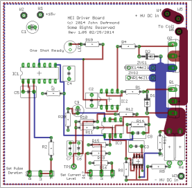 This shows the transistor, coil, capacitor (white object, upper left) and one of the ignition coils. The PCB design has the transistor and TVS mounted on the board while the capacitors (one for each 2 coils) is mounted directly to the coils. The heavy current-carrying leads should be at least 14 gauge (I use silver-plated teflon insulated wire with 1000 volt insulation rating. They should be twisted to minimize radiated EMI.