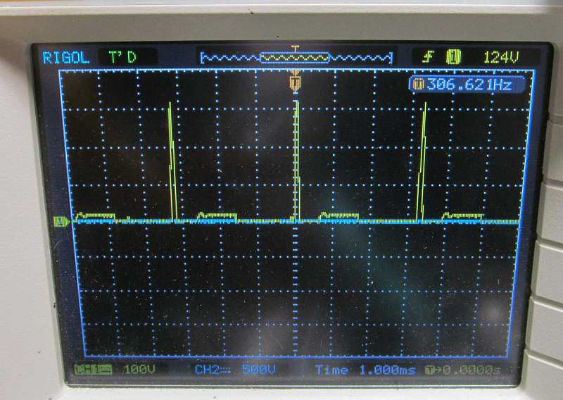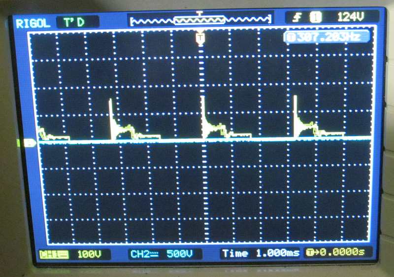 This is the same connection as above but this time the secondary is being allowed to arc. Notice that the peak voltage is much reduced but that the event lasts much longer. Something in-between these two is what you'll see with an X-ray tube connected. The tube will load the secondary so that current flows longer during the off period. That's what we want. Current flow = X-ray production.
