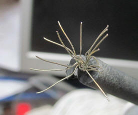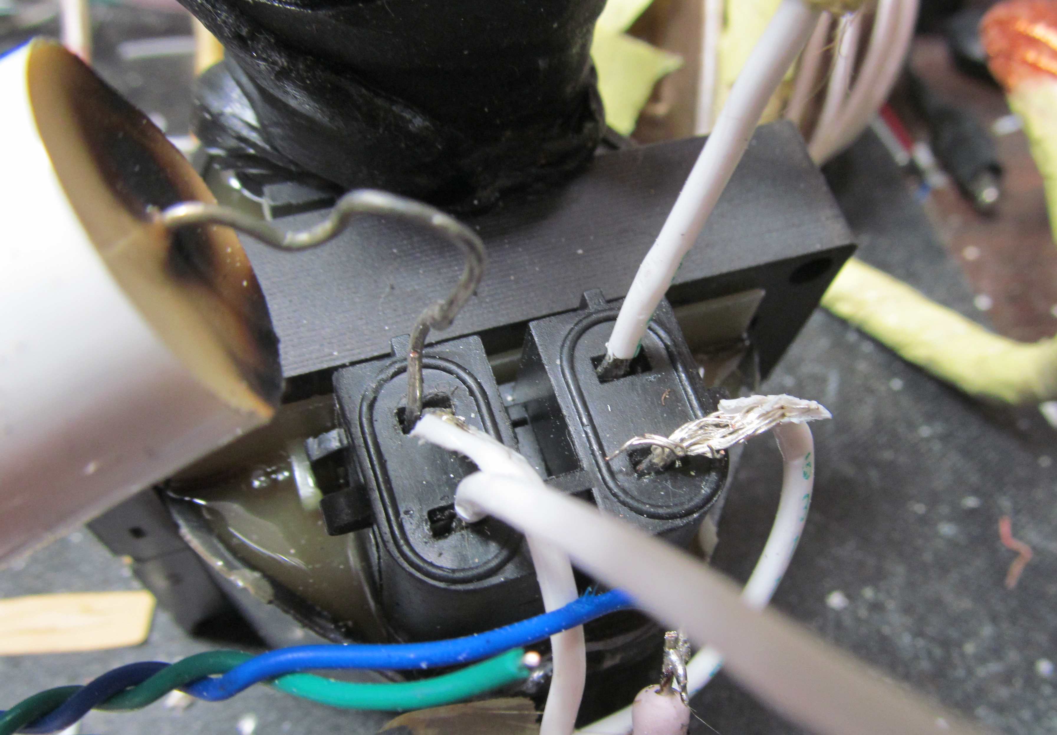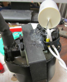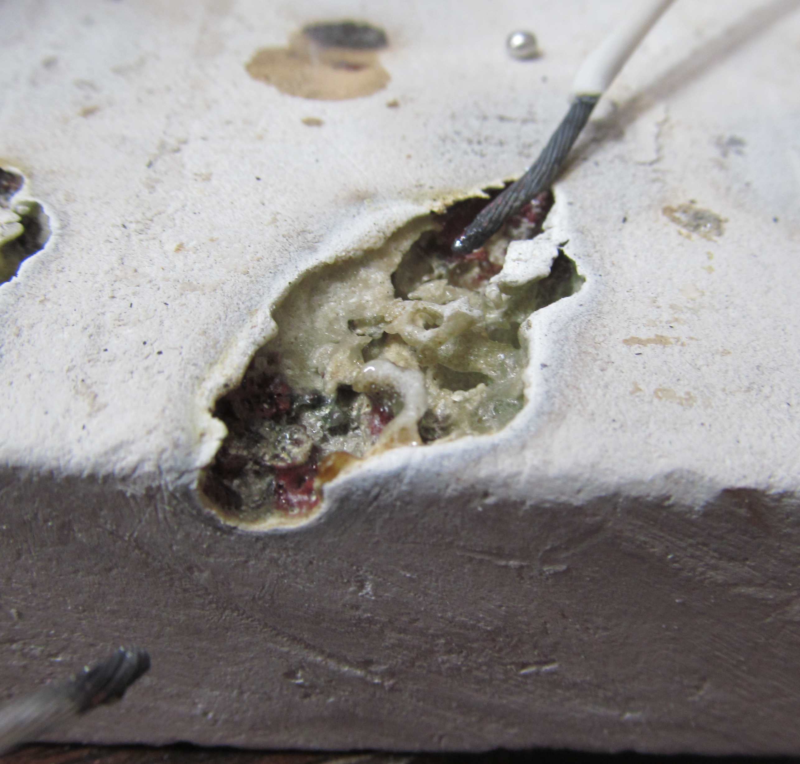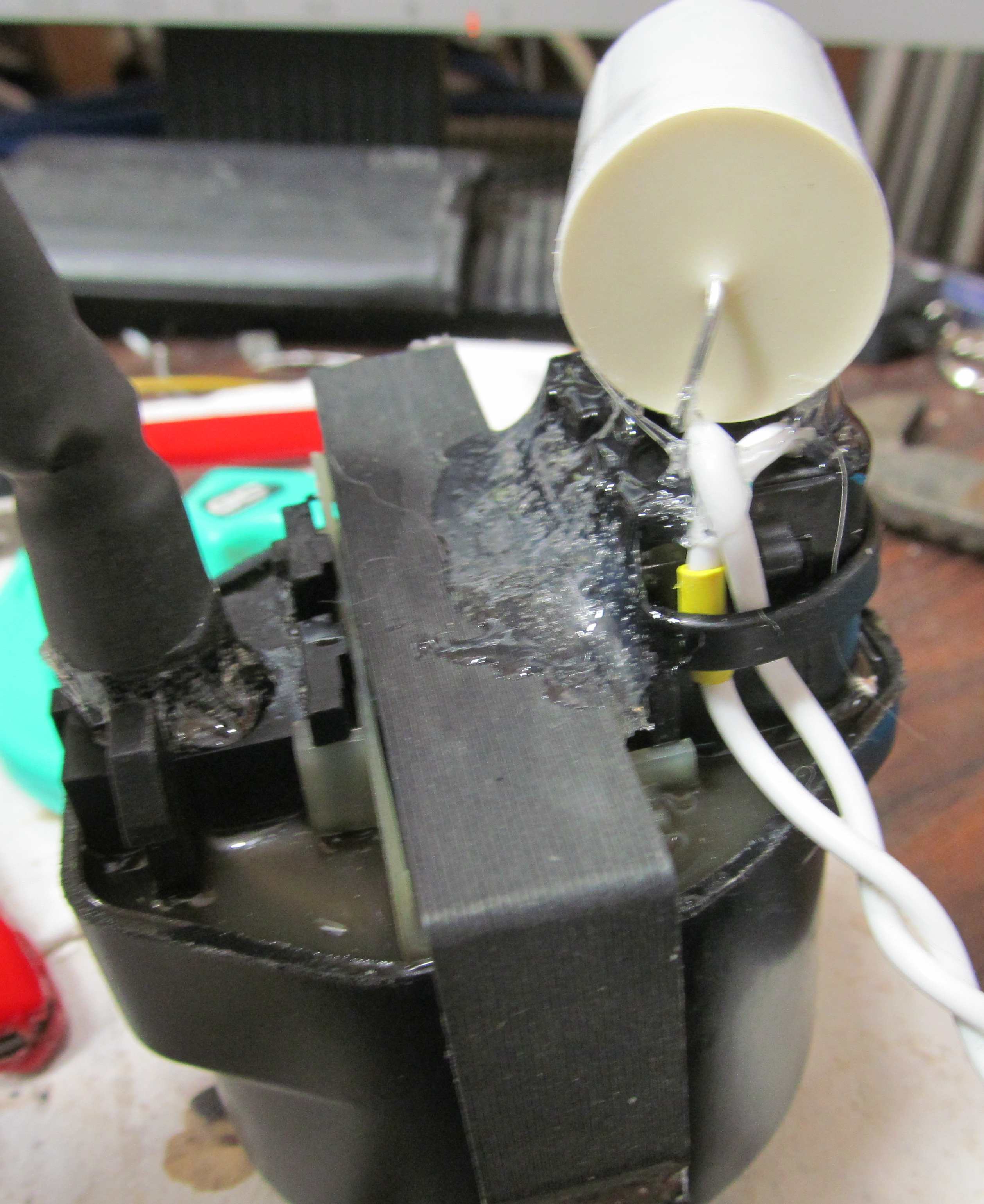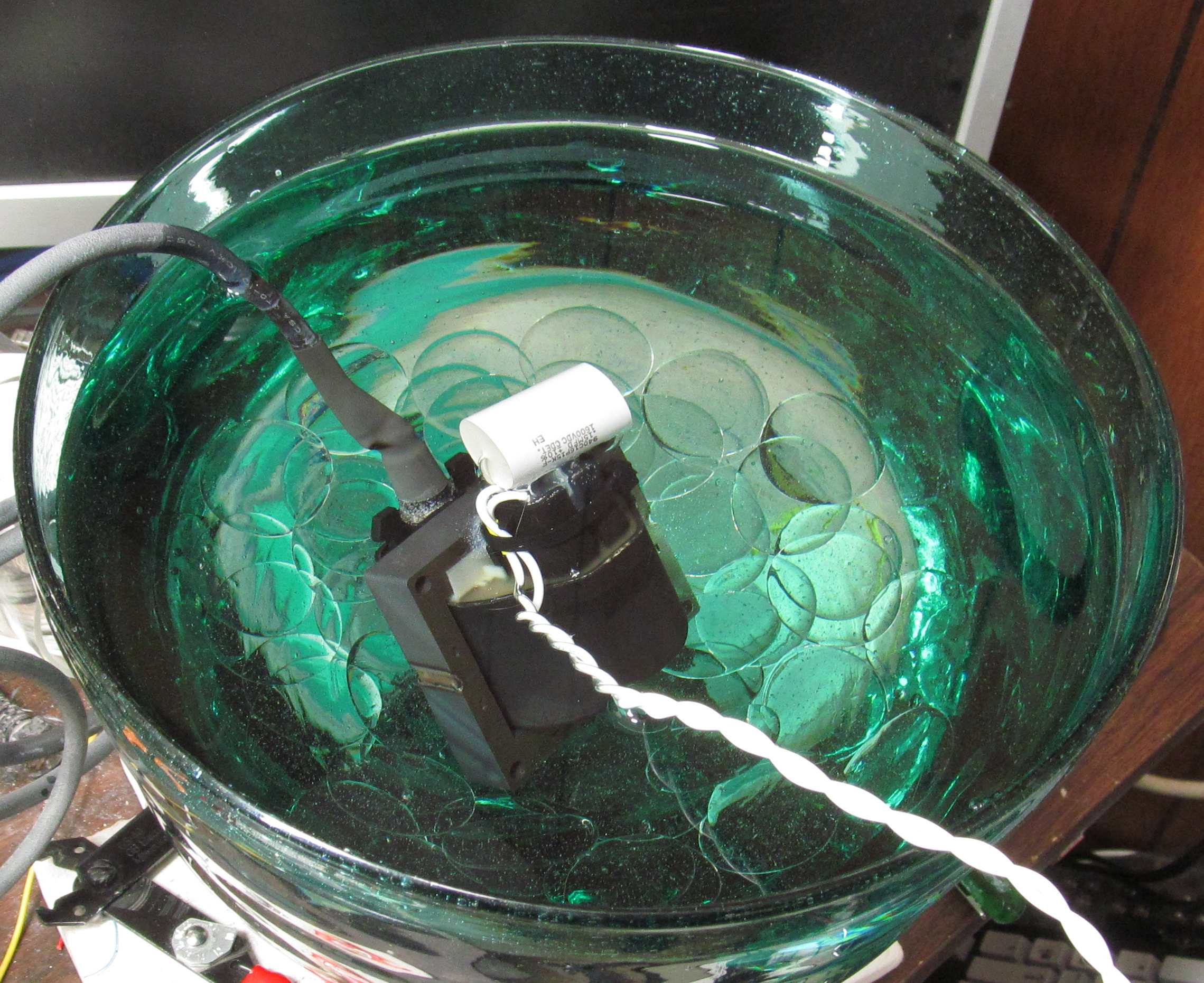 Finally, who can resist some destructive testing :-) OK, so I threw the whole 120 VAC output of the driver at just one coil. Just curious. Took about 3 minutes of arcing to fail. The failure was anti-climactic. Just a gentle pop, a little smoke and that white ooze. And amazingly enough, even though wire ends are visible in the ooze, the coil didn't quite sparking. This gives me even more confidence that a set of 4 oil-immersed coils will run continuous duty, even at full output. |