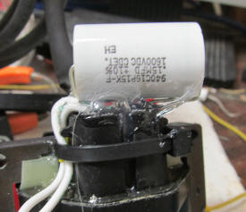 These two photos show the treatment I gave the coil (all 4 will get the treatment when they arrive) before immersion. I coated the high voltage tower with Shoe Goo (polyurethane resin before heat-shrinking some tubing on the tower. This is mainly to hold the cable upright and provides minimal dielectric qualities. I Shoe-gooed the places where flash-over is likely to take place. Finally, I glued the snubber capacitor in place with Shoe goo. It is vitally important that this capacitor not become disconnected, thus the adhesive.