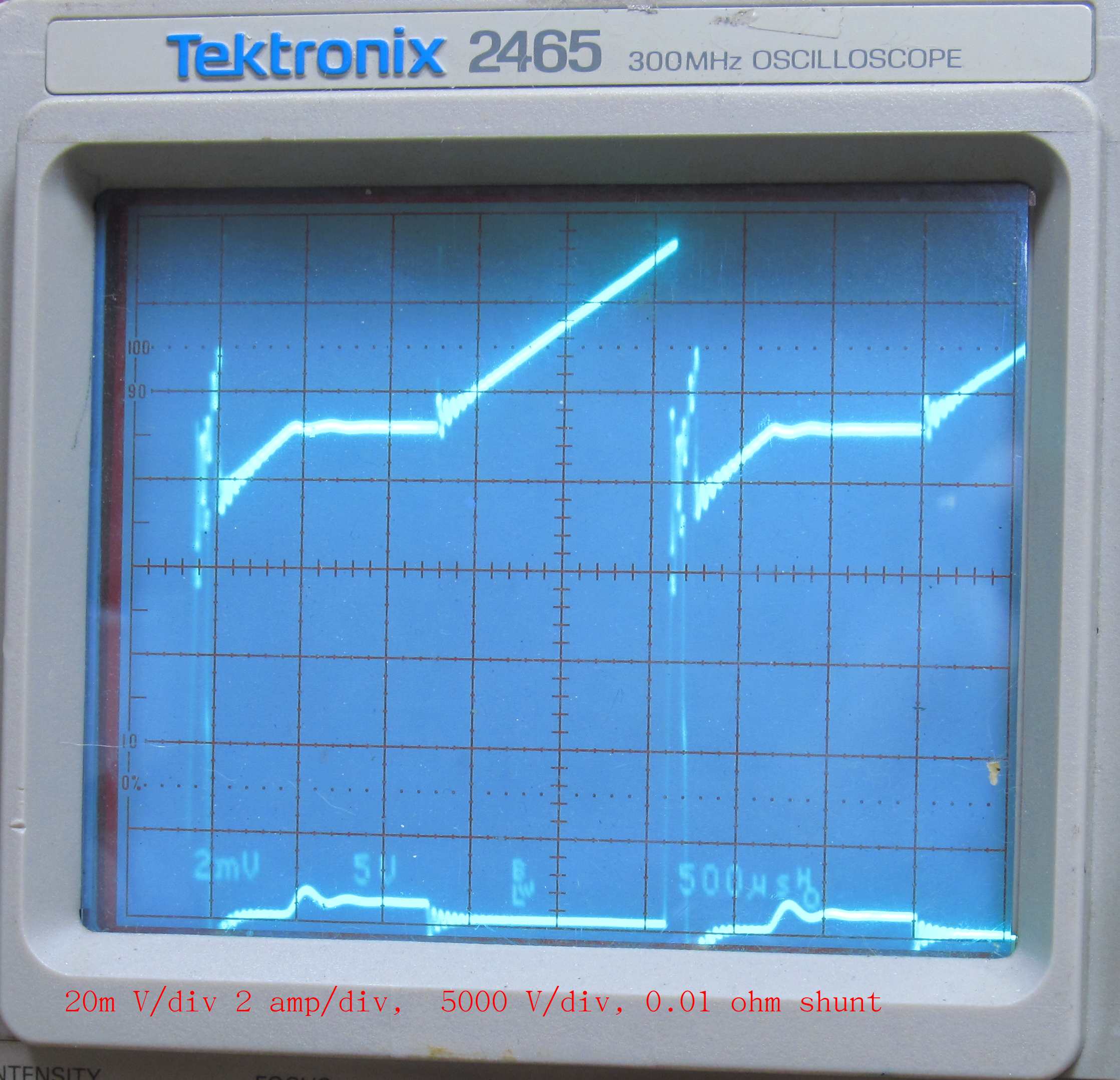These two scope shots show the most important waveforms. In each shot, the upper trace is the shunt current directly off the 1 ohm shunt and the bottom trace is the high voltage output pulse measured via a Tek P6015 high voltage scope probe. Typical of the over-engineering of the Tektronix of old, the probe is rated for 45kv peak max but so far it has functioned properly at 120kV. Of course I was NOT holding the thing!!! The top trace is with the incoming DC set to about 12 volts. The output voltage is about 40kV, just what one would expect from an HEI coil. In the second photo, the current setpoint has been turned up. As you can see the current rises much faster. The output pulse is about 60kV. Turning the current up at a given voltage slows the rep rate. A higher incoming voltage causes the repetition rate to increase. Thus you can adjust the two to maintain a given voltage at higher or lower output current levels. With 120 volts in and a bit higher current limit, the wail is like a banshee, running at between 2 and 3 kHz.