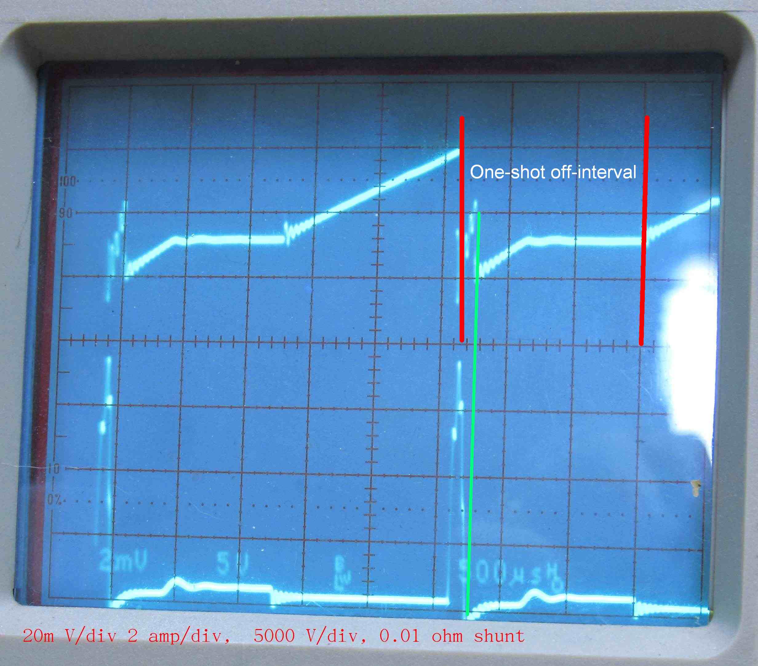 Once you have the board constructed, it needs to be set up for initial operation. These instructions will get it running and then you can adjust it for the desired voltage and current as need be. Set the "off interval" pot R3 to the mid-point. Set the current limit pot R17 to about 3/4. Arrange the high voltage lead as shown at left at least a foot away from other object. This "corona dummy load" provides a bit of load to the coil and prevents very high voltage excursions. Connect your scope to TP1. This test point is an amplified version of the current waveform across the shunt. . Apply 12 to 24 volts to the board and adjust R17 if necessary to get the oscillation to begin. Once the oscillation begins, you may turn down the voltage if you desire to reduce the magnetostriction and spark gap noise. In the photo below, the two red lines show the effect of the "off interval" pot R3. I used fixed resistors in the prototype and so the off-time is much too long. Adjust R3 until the time interval is about the distance between the red and green lines. If operation is not smooth then add just a bit more time. The shorter this time interval, the faster the rep rate for a given input voltage and current setting. |
