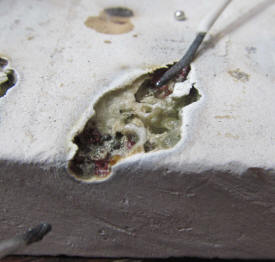 The repetition rate is dependent on both the driving voltage and the current setpoint. In general, you want to adjust the setpoint and the timing pot R3 so that the driving waveform on the gate of the IGBT is as close to a square wave as possible. When that is achieved, the current is turned back on the instant the coils discharge and because of the high driving voltage the coils recharge very rapidly. This video shows you the sound and fury of the unit running with about 50 AC volts incoming. At 120 VAC in, one really needs hearing protection because of the howl of the cores' magnetostriction. The photo at left shows what the result of the arc in that video did to some high temperature refractory board. There was about 500 watts input to the system. Quite a lot of power in a small place. |