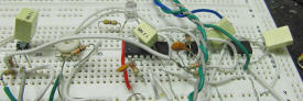 This photo shows the breadboarded design. From left to right, the LMC6482 op-amp, the 4047 one-shot, the LM393 comparator and the MC33152 dual gate driver.