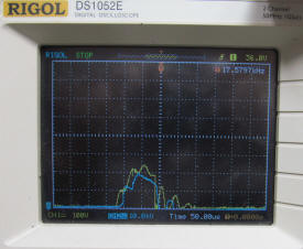 about 20kV to 120kV. This vid shows R17 being turned to smoothly vary the voltage from about 20kV to about 80kV. This is with 28 volts in. As indicated, the unit should be turned on and off by switching the 15 volt power supply to the board after the HVDC is applied. Applying 15 volts first can lead to a very high voltage initial pulse which can destroy the transistor. There seems to be some concern on the XRL mailing list that this driver is too powerful and that it would not be useful for such applications as XRF. Nothing could be further from the truth. The scope shot at the left (yellow trace - IGBT collector, blue trace - high voltage outptu) shows the driver operating smoothly at just a touch over 20kV and 28 volts in. Notice that the rep rate is 28kHz. Nice smooth high frequency output. If the input voltage is taken lower, say to 12 or 14 volts then the driver can go to 10kV or less. This is a truly versatile driver. |