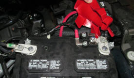 This shows both cables properly attached to the battery. The red cable lug is just barely visible to the right of the cluster of cables. It is taped up with black electrical tape to reduce the possibility of shorts. | ||||||||||||