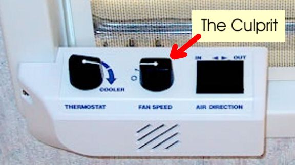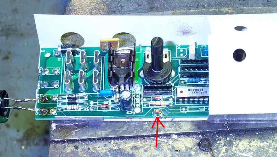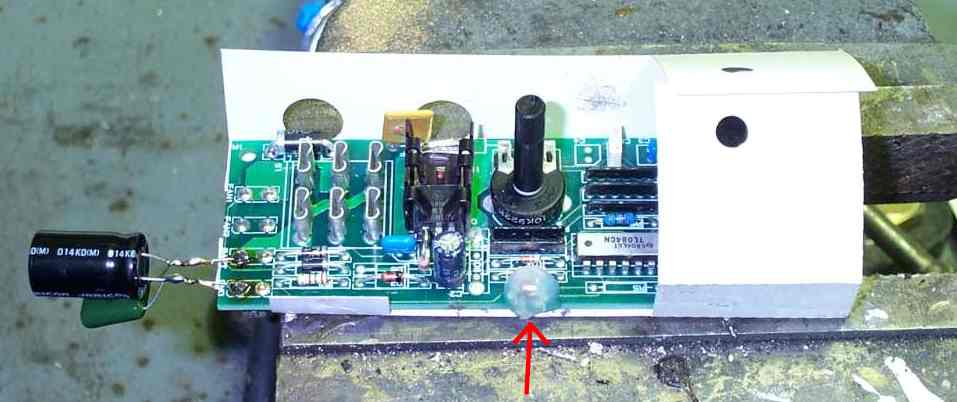 | The red arrow points to the thermister that senses the air temperature and signals the thermostat. The thing is very small and of low mass which makes it respond to air currents. The proper way to slow this response is to design in some delay in the electronics. Since I didn't want to modify the controller itself, I added thermal mass to the thermister. |
