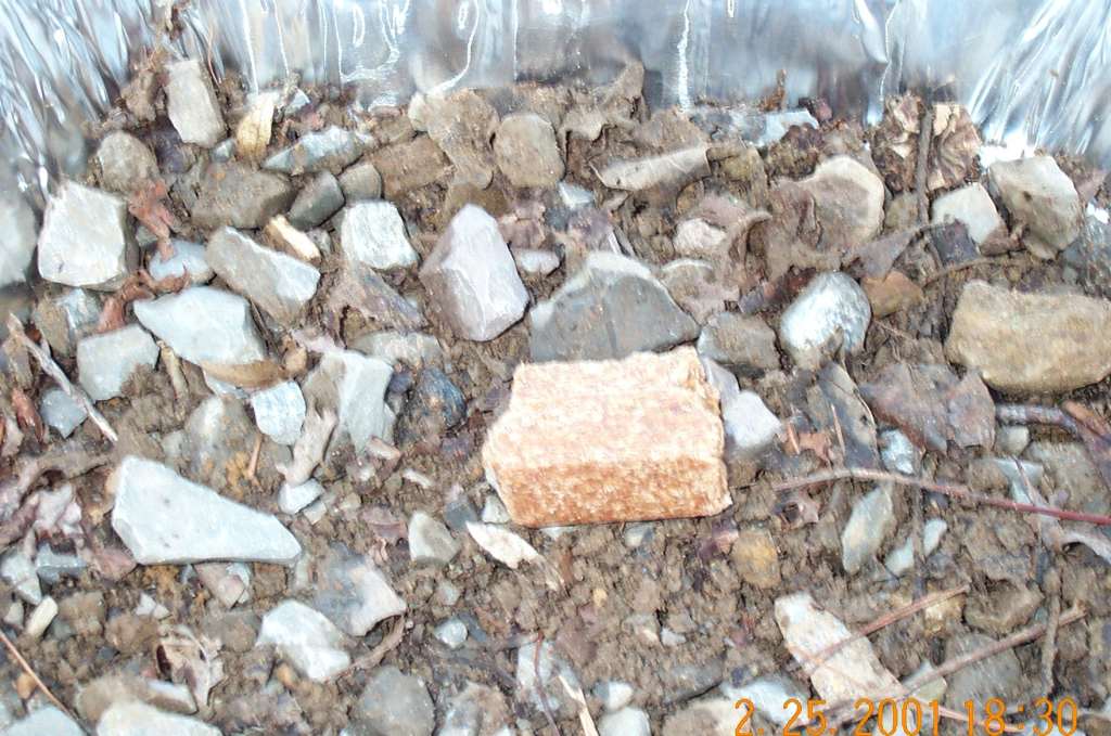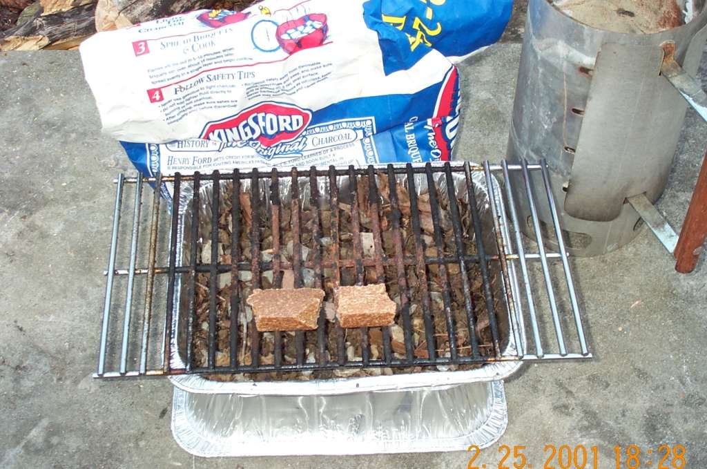| On the gravel we place a small square of fire starter. This is a mix of wax and sawdust. It starts the charcoal without leaving any taste like starter fluid does. |