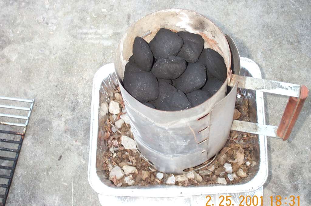 | Next goes the charcoal starter chimney and the charcoal. The chimney instructions say to use wadded up newspapers. That works but the fire starter chunk is easier to store and starts the fire much more reliably. |