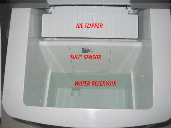 ![]() The ice flipper, the "full" sensor and the water reservoir are visible here. The ice basket sits on the slight ledge so the water level should remain below the ledge to avoid immersing the cubes in water |