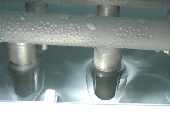![]() This shows the beginning of the harvest or dump cycle. The water tray has dropped away, dumping the remaining water back to the sump. The hog gas valve has been opened. Note that the hot gas line on the left has already thawed. In another couple seconds the whole assembly will be warm enough that the cubes fall away by gravity. |