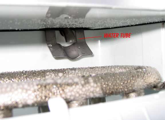 ![]() Here several parts of the ice making apparatus are identified. Note the refrigerant tubes on the left and the curved bracket on the right. I had to slightly bend these parts to fully immerse the cold fingers in the water |